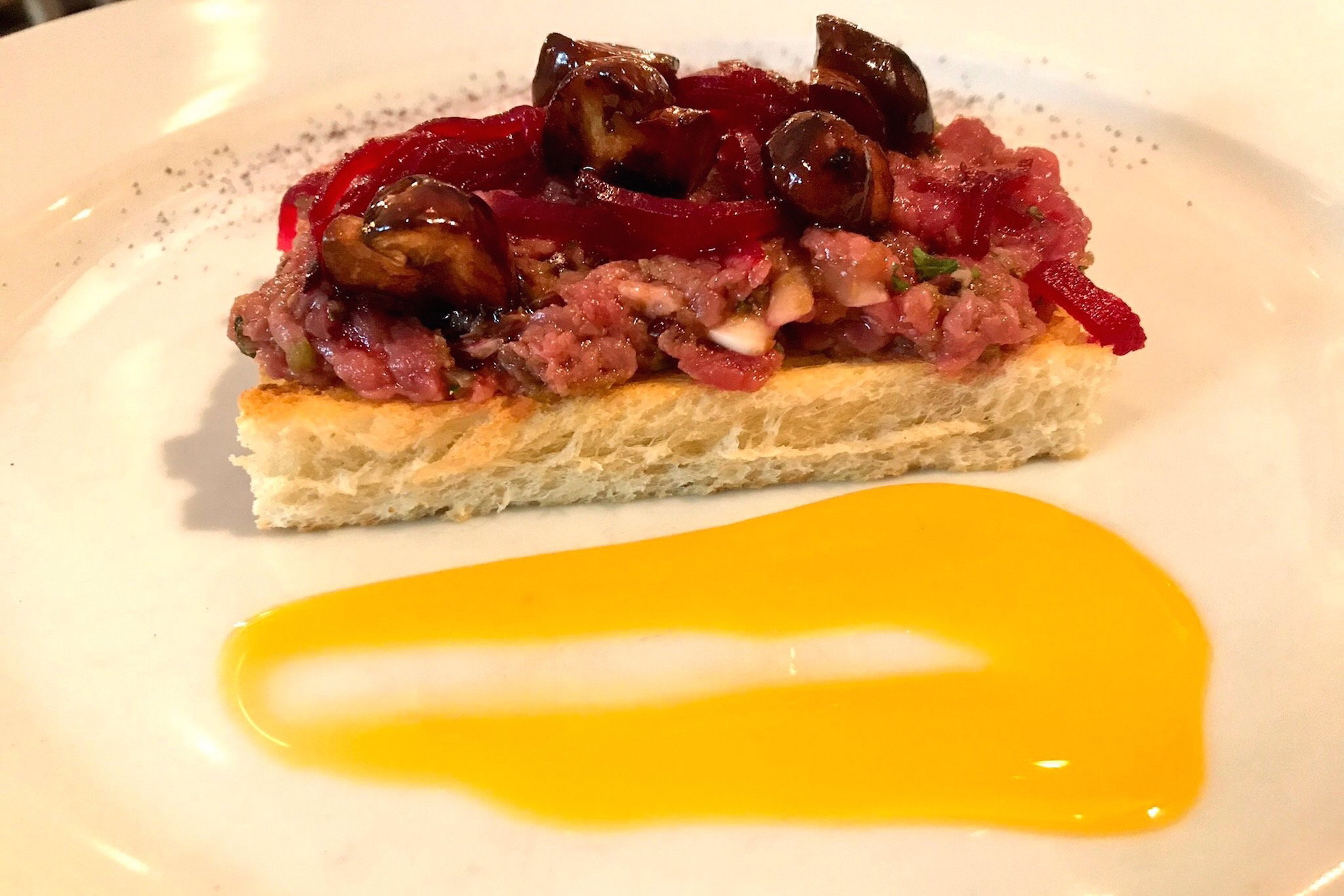Daarna nemen we plaats in het restaurant en krijgen we onze eerste gerechten geserveerd. Mijn steak tartaar is van bavette en wordt geserveerd op een toast van brioche. Daarbij gezouten biet, eigeel en champignons. De tartaar is gemengd met carnichons, kappertjes en sjalotjes, die vooraf zijn aangemaakt.