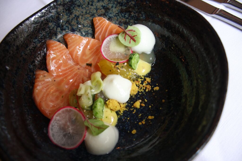 Het eerste gerecht is er een waarin direct de lokale invloed zichtbaar is: licht gebrande makreel met zoete pepertjes, framboos uit de Betuwe, een gefrituurd krokantje en een kruidenbouillon van tomatenuitlek gemaakt op de ‘hangop-manier’. Het gerecht is licht, smaakvol en contrastrijk. De zoete framboos uit de directe omgeving is de grote verrassing in dit visgerecht.
