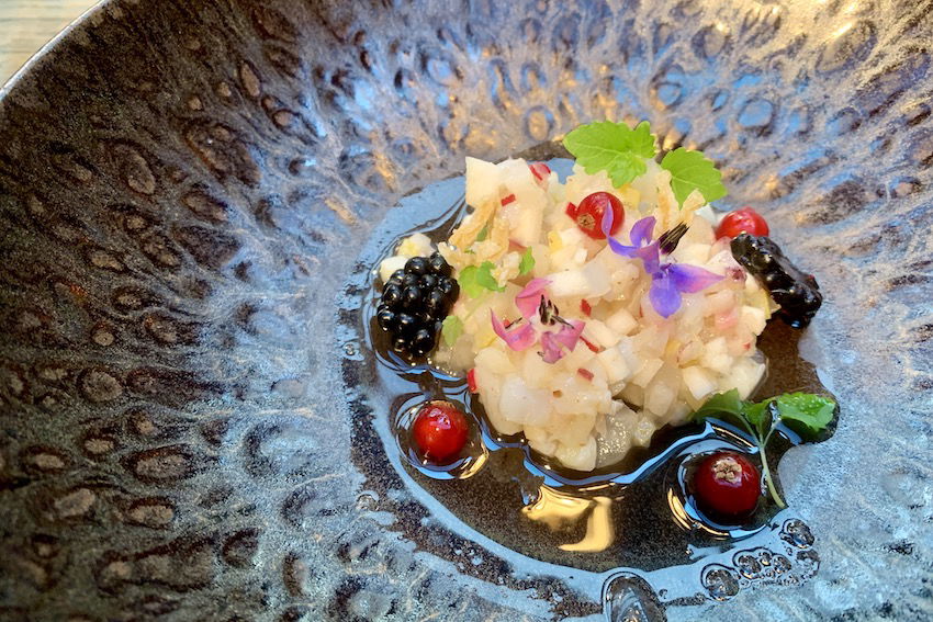 Het menu start met inktvis en kwal, verwerkt tot tartaar en voorzien van een heerlijk zuurtje. Een smakelijke ceviche-bereiding, zou je kunnen zeggen. En tevens een lust voor het oog. Dat is weliswaar niet waar het om gaat, maar wel een mooie bijkomstigheid, aangezien we meerdere zintuigen aanspreken tijdens het genieten.