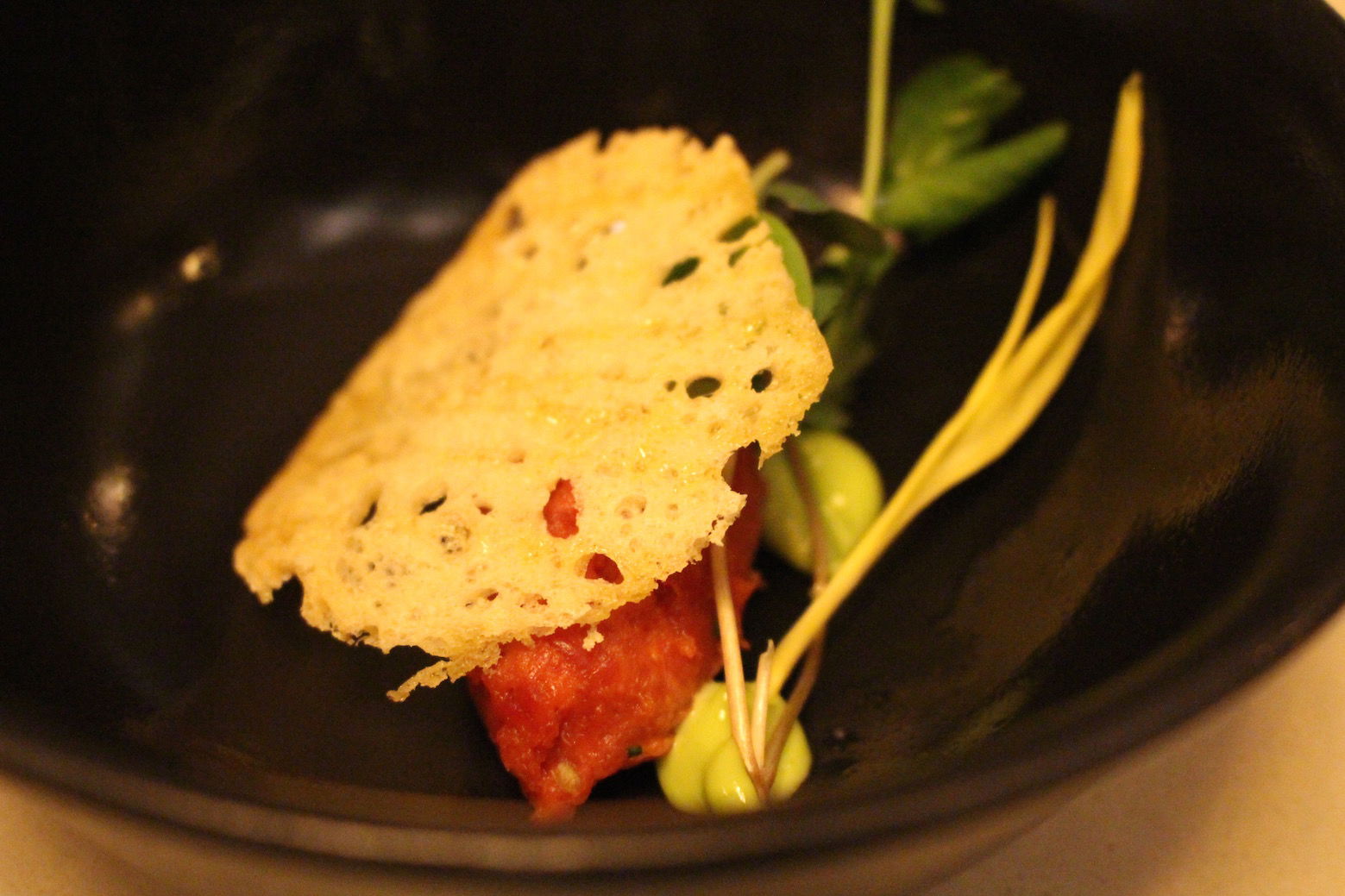 Gang twee bestaat uit een plateau met daarop vijf gerechten onder de noemer ‘meet the new Americain’. Mijn favoriet is de tartaar van rode biet (frisse salade kruiderij, fijne sjalot, knoflook en een bouillon van framboos en granaatappel). Die kruiden zijn een tweede ‘signatuur’ van Peter, die er graag en veel mee werkt.