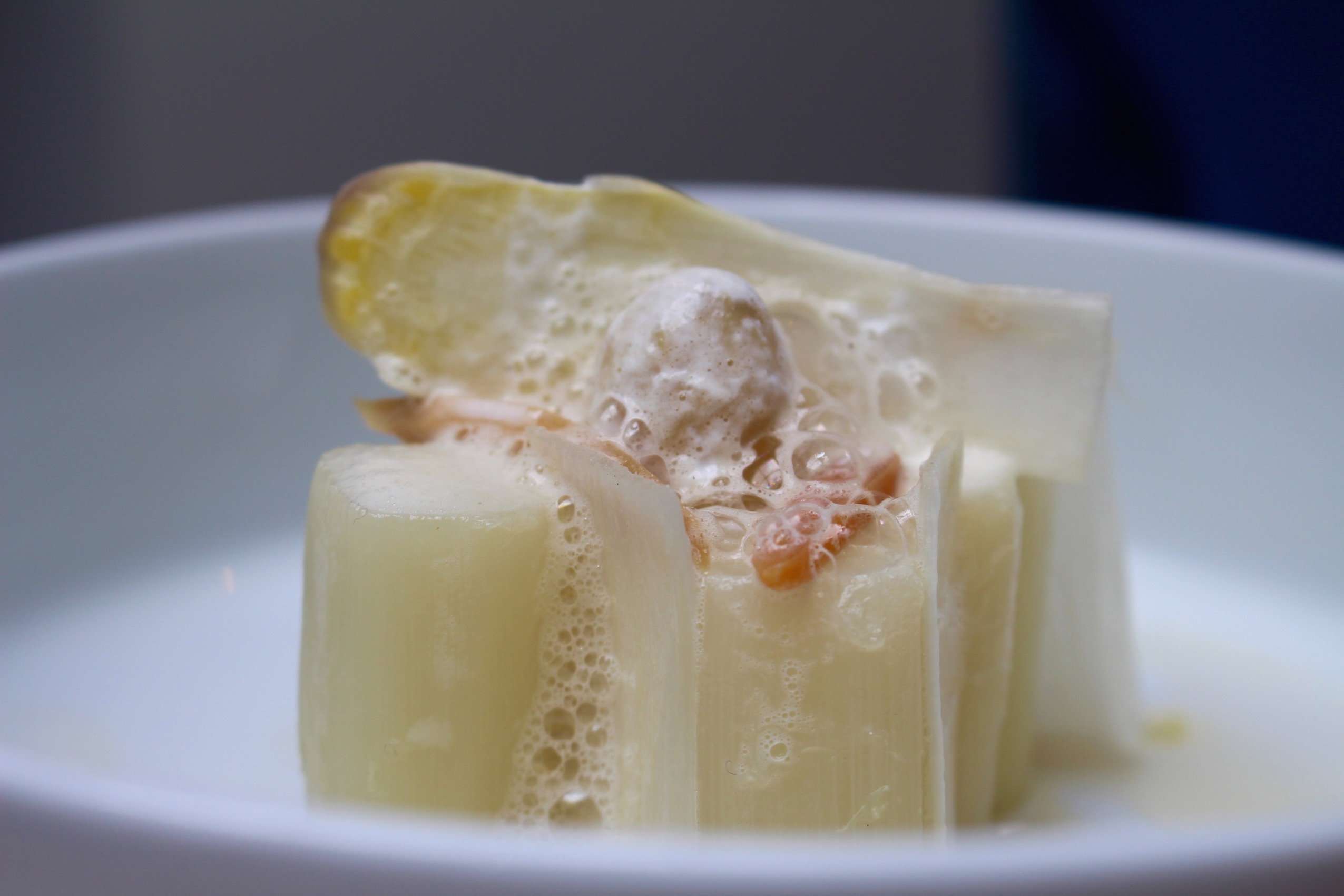 Aan tafel krijgen we vier gangen geserveerd. We trappen af met de koningin onder de groenten: witte asperges, met hooi-saus en bottarga (viskuit). Beide elementen voegen een prachtige smaak toe aan het toch al heerlijke ‘witte goud’. Fantastisch!