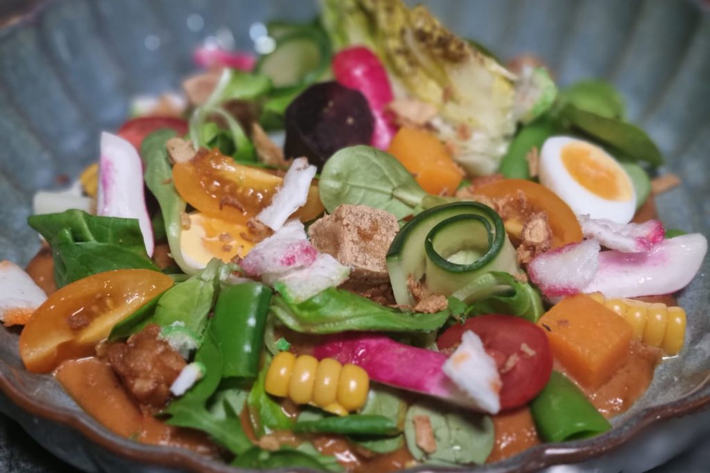 Wie een traditioneel Indonesisch gerecht als gado gado in Indonesië bestelt, krijgt een bord vol groente met pindasaus in een nauwelijks gestileerde vorm. Heerlijk, maar niet fotogeniek, stelt Eduard..