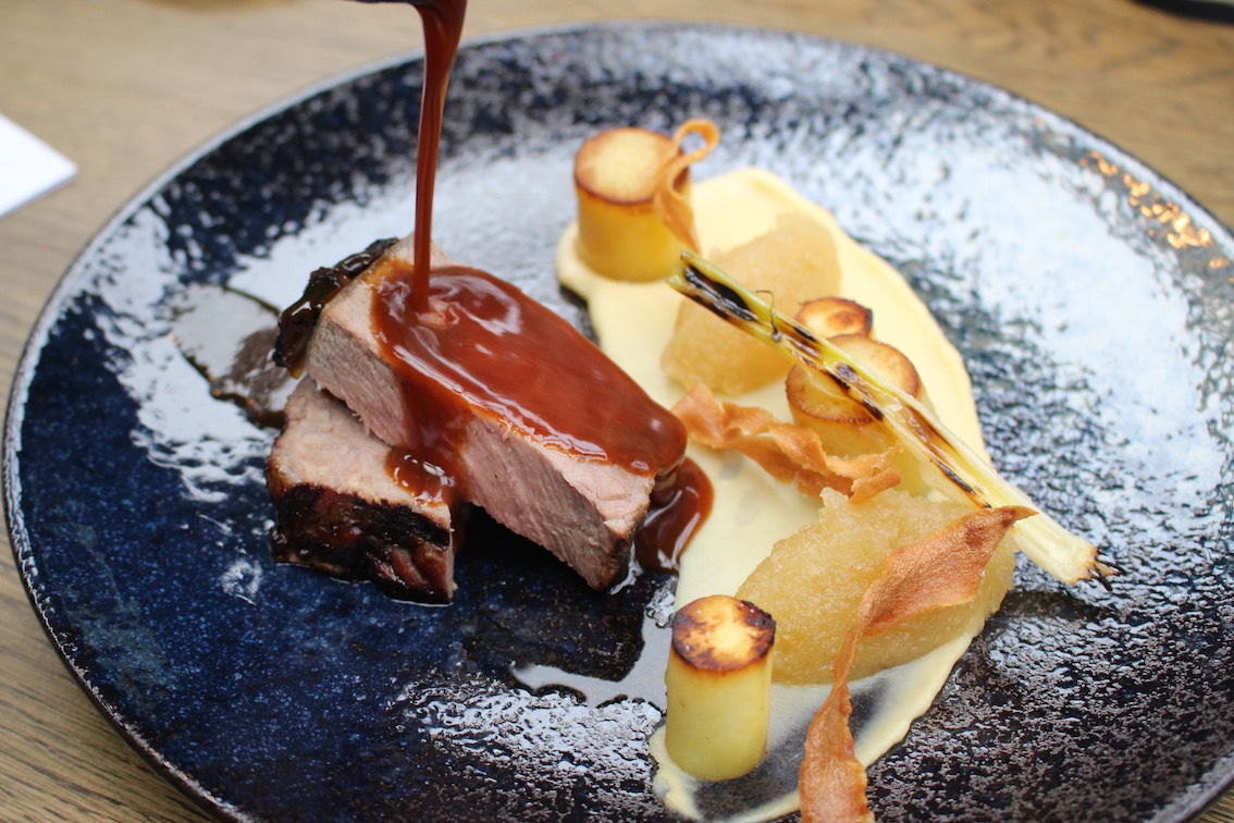 Structuren van pastinaak, een choucroute van ui en runderjus begeleiden de entrecote, die als hoofdgerecht wordt geserveerd.