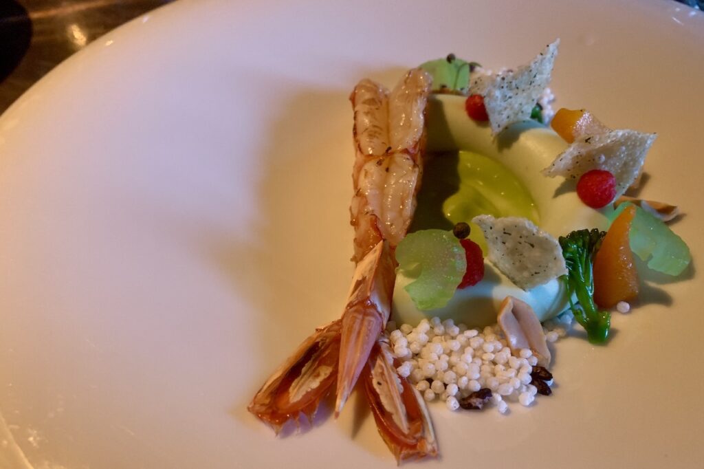 Wij kiezen het viergangenmenu en starten met gamba, groene curry en een emulsie van lavas (maggiplant). Voor mij de topper van de avond. Onder andere vanwege de mooie pittigheid die curry het gerecht geeft.
