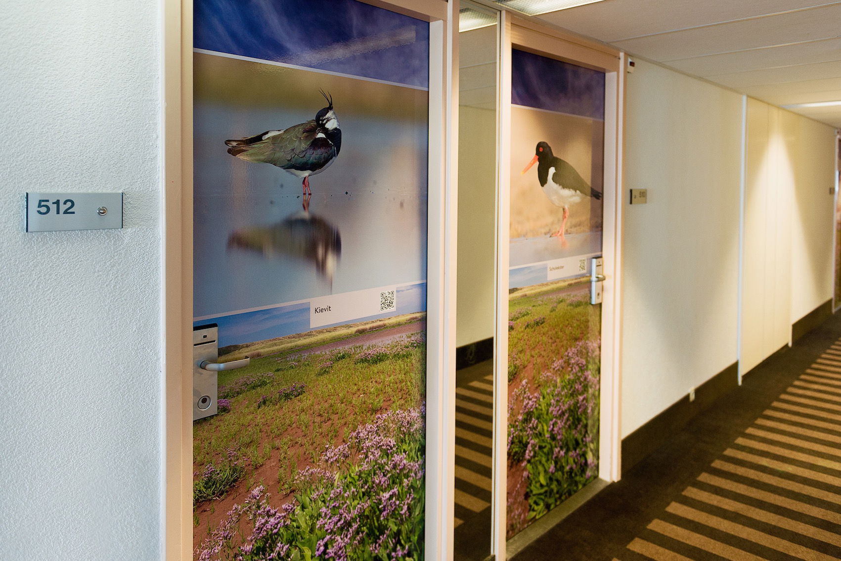 De kamerdeuren zijn bedrukt met afbeeldingen van dieren en planten die voorkomen in het Waddengebied.