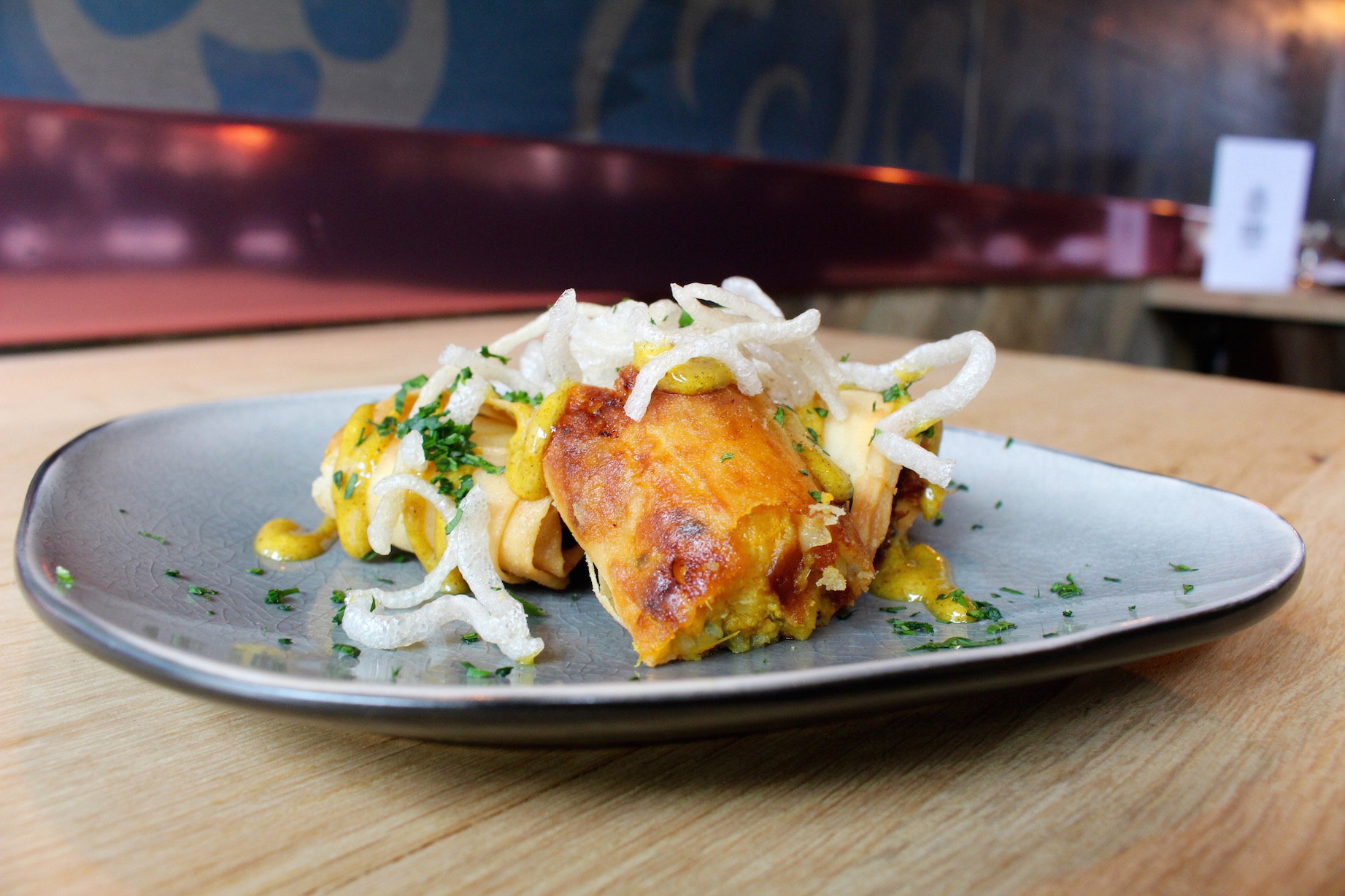 Onze lunch start met drie smakelijke gerechtjes indo street food. De ‘Taco ayam besisit Bali’ is een taco met pittige Balinese kip, Bangkokspread en kentjoer-kokosmayonaise’.