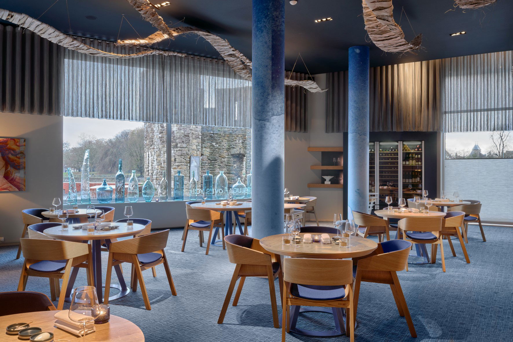 Servais Tielman: ‘De gast maakt een reis door drie werelden door middel van een verplaatsing door het restaurant en dat is voor zover mij bekend uniek in Nederland. De ontvangst vindt plaats in ‘Bosco’, een mystieke bosachtige setting waarin hout en natuurlijke materialen de boventoon voeren. Hier serveren we het aperitief en de amuses, die op handgemaakte houten plankjes worden gepresenteerd. Daarna nemen we de gast mee naar ‘Aqua’. Deze ruimte kijkt uit over de Maas en Maastricht en biedt plaats aan 30 gasten’.