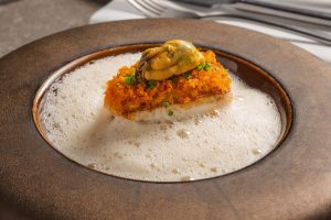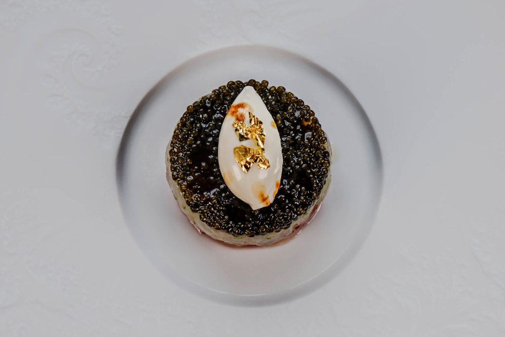 Elegante tartaar van kalfshaas en langoustine, afgewerkt met kaviaar, crème cru en bladgoud voor een luxueuze presentatie. De verfijnde vinaigrette van bisque, citrus en vanille voegt diepte en frisheid toe. Perfect in balans tussen zachte texturen, ziltigheid en subtiele zuren.