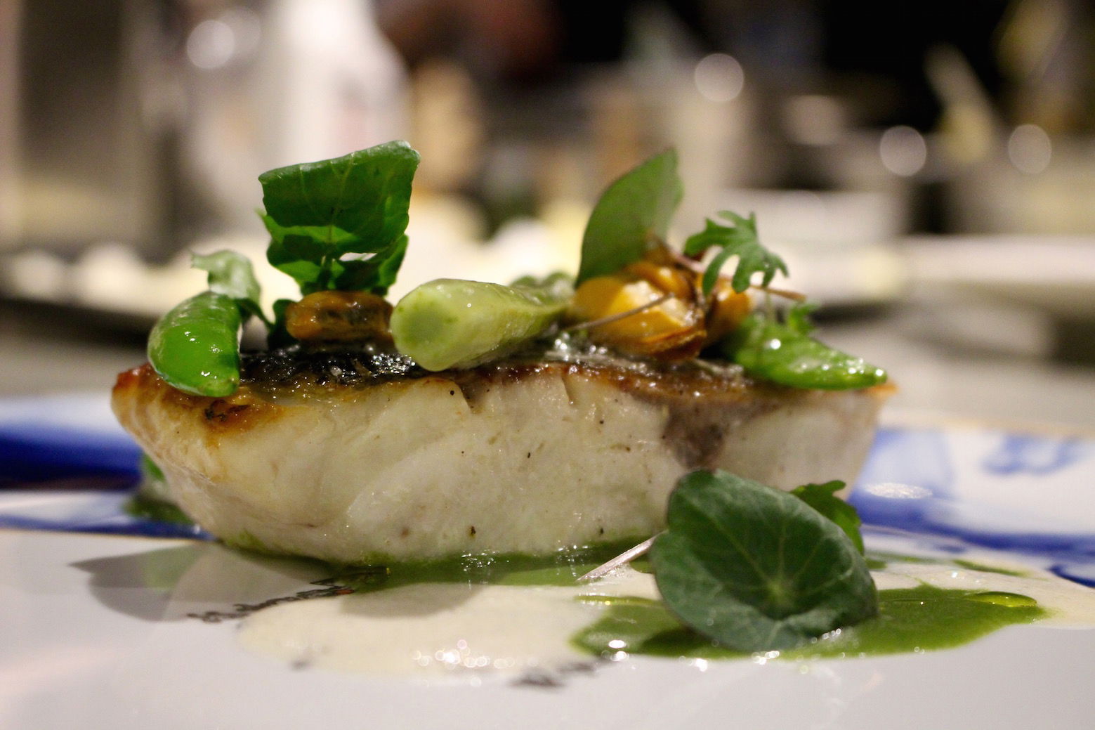 Het restaurant is sfeervol ingericht en biedt uitzicht op een fantastisch mooie open keuken. In die keuken staat sinds drie maanden een nieuwe head chef. Sander Bierenbroodspot heeft De Vrienden van Jacob in Santpoort ingeruild voor Bluespoon, waar hij voor het eerst ‘op eigen benen staat’. Hetgeen past bij zijn ambities.