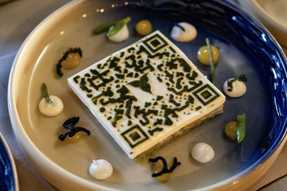 Sterchef Tim Golsteijn serveert in restaurant Bougainville in Amsterdam een gerecht met een eetbare QR-code. Wie deze scant, ziet een video over het hoofdingrediënt: een zeebaars uit de wateren bij Rotterdam. ‘Onze producten hebben prachtige verhalen, door daar beleving aan toe te voegen, nemen we de gast daarin mee.’
