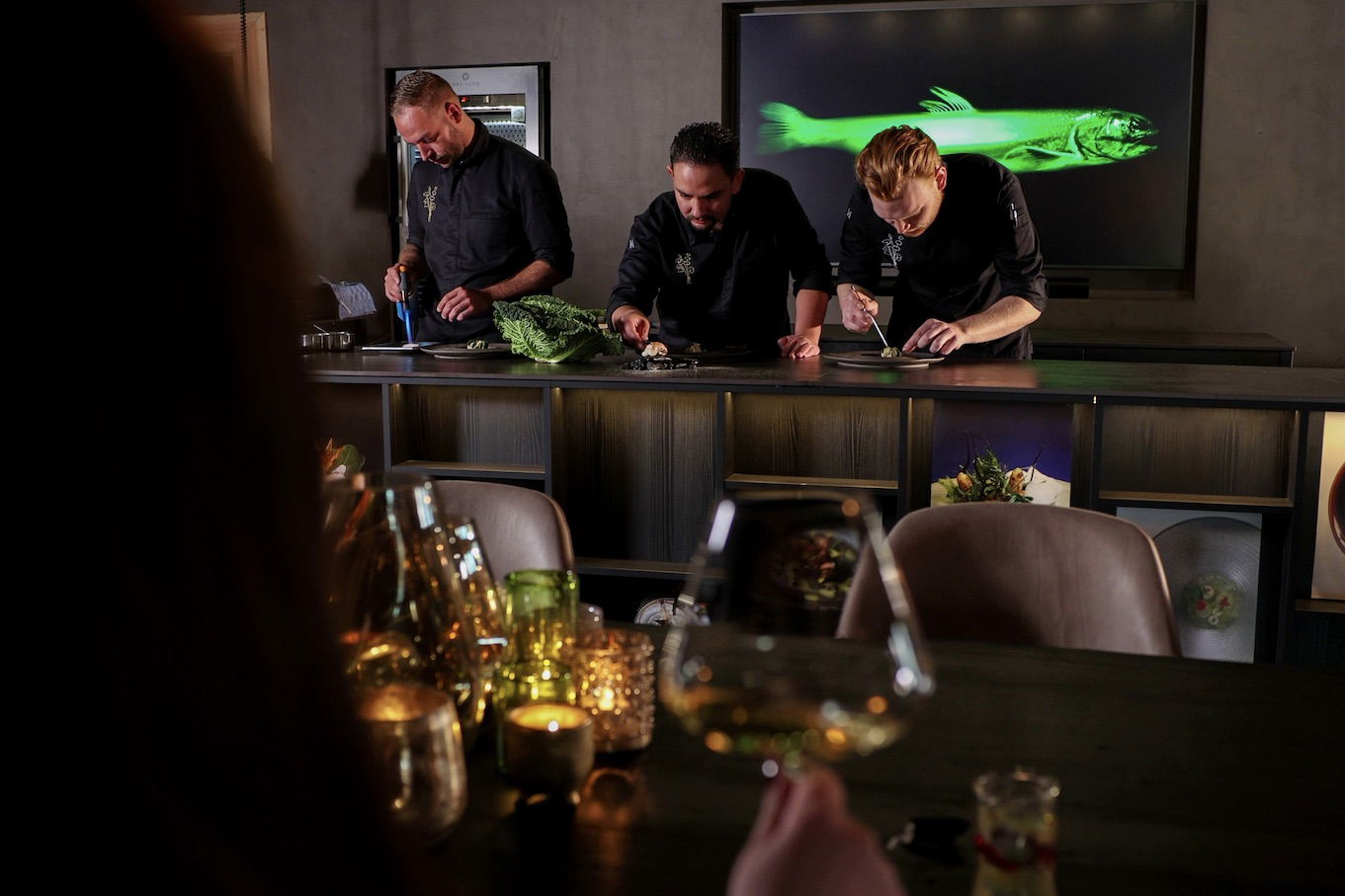 ‘Gasten maken kennis met de verfijnde technieken van de chefs, die de gerechten ter plekke bereiden. Het verhaal over de ambachtelijke producten en leveranciers wordt gedeeld en de gasten doen zelf mee bij het maken van een gerecht.’